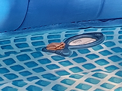 Dazwischen auch Momente, die nur begeistert Staunen lassen. Ich wollte meine Hitze gemütlich im Pool runterkühlen. Ungläubig starrte ich ins Wasser. Ein kleiner Frosch – clever abwartend auf dem Wasserthermometer. Ganz vorsichtig ein paar Fotos machen. Dann die Rettungsaktion mit dem Kescher, der normal für die reingefallenen Blätter im Wasser gedacht ist. Doch der Frosch entschloß sich, sich lieber schwimmend vor uns in Sicherheit zu bringen. Othmar hat ihn dann doch erwischt und neben die Wassertränke im schattigen Garten in die Freiheit entlassen. Ein Sprung – weg war er.