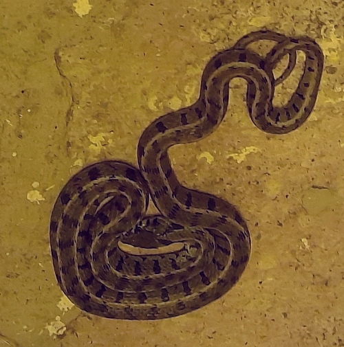 Weniger erfreut hat mich dieser Tage nachts dieser Anblick. Bevor ich ins Bett gehe, drehe ich immer noch eine Runde und schaue auch nach den Katzen. Direkt vor der Haustür hat mir einer dieser Jäger ein Geschenk gemacht. Ich hatte mich schon gewundert, dass alle ganz aufgeregt vor der Tür waren. Sogar unser streitlustiges Lieserl war diesmal dabei. Fasziniert hab ich mir diese Schönheit aus sicherer Entfernung angesehen, dann natürlich Fotos gemacht – und Othmar zu Hilfe gerufen. Der hat vorsichtig die Schaufel unter die Schlange geschoben und sie unter einen großen Busch setzen wollen. Doch sie war noch quietschlebendig, schlängelte von der Schaufel blitzschnell runter und verblüffte uns mit gut 1,50 m Länge.