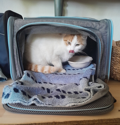 Damit nicht alles glatt läuft, gibt`s natürlich die Stolpersteine. Ich habe aus München zwei Transporttaschen für den Flug von Möpl und Suse mitgebracht. Suse wird täglich darin gefüttert, da sollte es also keine Probleme geben. Möpl`s Tasche geht allerdings gar nicht. Ich hab ihn in jeder Position vorher gemessen, aber….. Er passt einfach nicht rein. Nun bringt mir Bine Ende April eine Neue mit, die den Flugmaßen bis auf 2 cm entsprechen. Da muss er jetzt einfach rein – gefaltet oder gepresst!