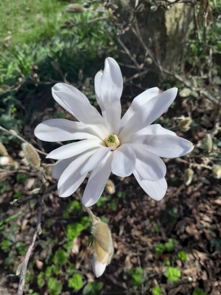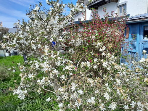 die Magnolie nun in voller Blüte, daneben die Blutjohannisbeere