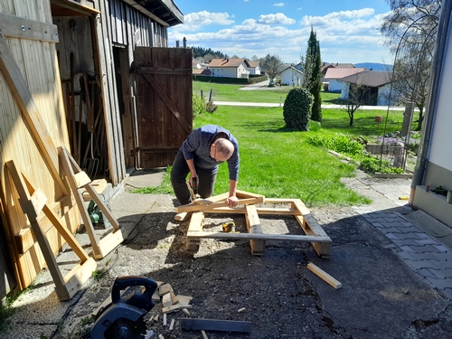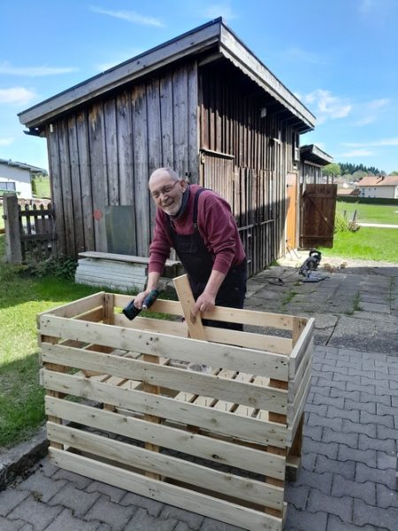 Nächstes Projekt – ein hohes Pflanzbeet. Vor einiger Zeit hatten wir bei unserem Baumarkt günstig acht Holzpaletten gegen ein Trinkgeld abstauben können. So wurde die Idee dann in die Realität umgesetzt. Upcycling ist der Gedanke, wenig Kosten und selber bauen. Doch zuerst mussten die Paletten mühsam zerlegt werden, bevor der Neubau starten konnte.